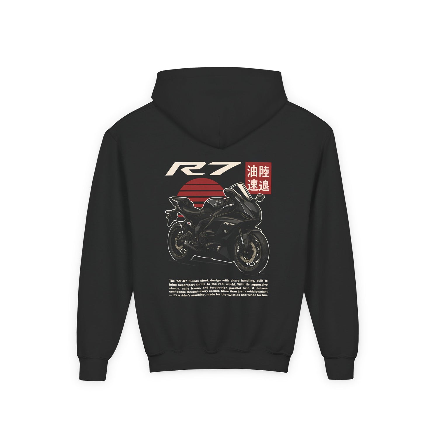 Let your little rider show their two-wheel passion with this YZF-R7 kids’ hoodie. Designed for comfort and fun, it’s perfect for young motorcycle fans who look up to real riders.